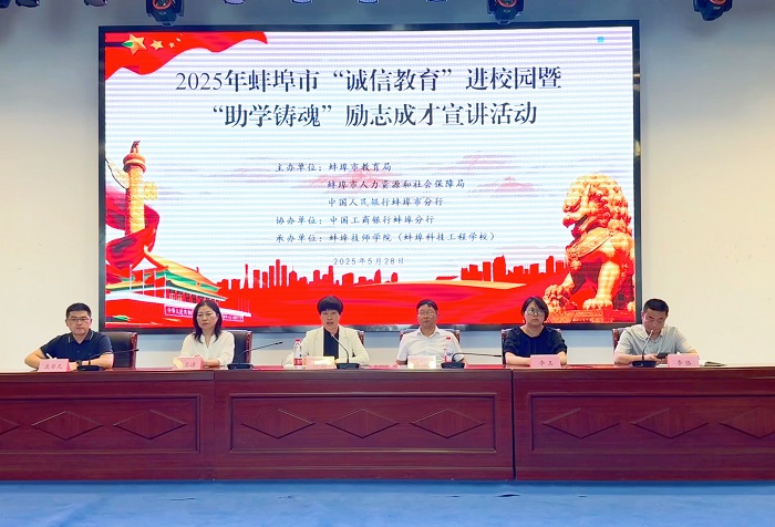 2025年5月28日,蚌埠市中职学校“诚信教育进校园”暨“助学铸魂”励志成才宣讲活动在蚌埠技师学院报告厅举行。活动由市教育局、市人社局、市人行主办,工商银行蚌埠分行协办,蚌埠技师学院承办,参会人员包括了4所中职学校的240名师生代表。