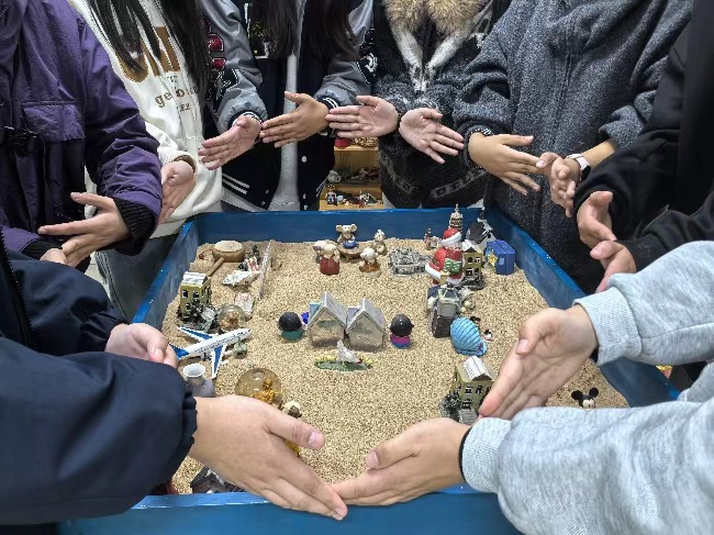 本次活动由我校心理辅导员刘芳老师组织。活动伊始,刘芳向同学们简要介绍了沙盘游戏的规则与“静默创作”的原则,引导大家放下评判,用心感受与表达。在轻柔的背景音乐中,同学们轮流选择沙具,在沙盘中摆放、创作。从最初的陌生与谨慎,到后来的默契与投入,一方小小的沙盘逐渐呈现出一个丰富多彩、充满故事的世界。房子、桥梁、神像、人物动物……每一个沙具的选择与摆放,都是同学们内心世界的无声表达。在分享环节,同学们围绕共同完成的沙盘作品,畅谈自己在创作过程中的感受、想法与发现。有的同学分享:“我拿彩虹桥,原以为它仅是好看,没想到投射出我想与外在世界尤其是与父母更好的沟通,把我内心最真实的需求呈现出来了,真的太神奇了。“有的同学在交流中触及到内心深处的脆弱,忍不住流下泪水。还有的同学分享道:“看到最后的作品,我发现自己并不孤单,原来其他人也和我想法类似。”整个过程充满了尊重、理解与温暖的氛围,最后竟一致通过”爱的世界“这个主题,同时大家不约而同的摆起了爱心的动作。