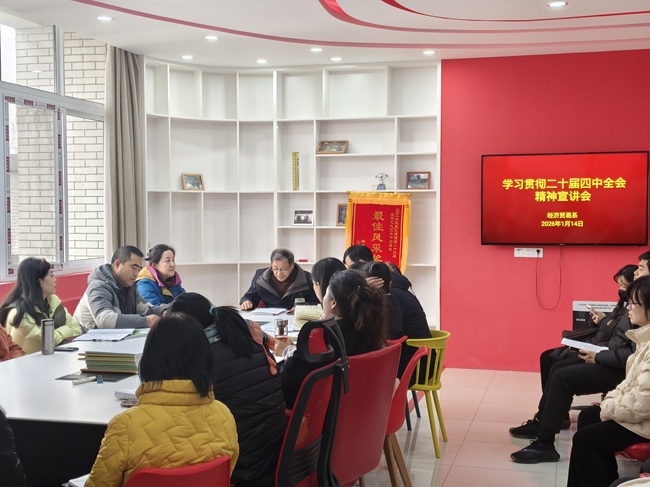 2026年1月14日下午,经济贸易系召开政治学习工作会议,专题学习党的二十届四中全会精神。包太平副院长莅临会议指导并作主题宣讲,经济贸易系全体教职员工参加学习。