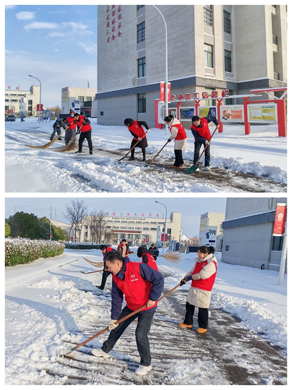 风雪虽寒,人心向暖。就在这片素白世界里,蚌埠技师学院第二党支部的教职工们,迎着寒风,踏雪而来。他们手中紧握的,不是课本与粉笔,而是沉甸甸的铁锹和宽大的扫帚。没有过多的言语,一行人便默契地投入到清扫工作中。铁锹与地面摩擦发出清脆的声响,扫帚划过积雪带起规律的沙沙声,共同奏响了一曲冬日里独特的劳动乐章。他们俯身弯腰,认真清理着主干道和台阶上的积雪与暗冰,每一次用力的铲除,每一次细致的清扫,都是在为学院的正常教学秩序默默护航,为师生开辟出一条条干净、安全的“放心路”。