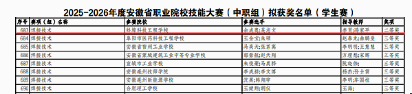 在近日落幕的2025-2026年度“中银杯”安徽省职业院校技能大赛焊接技术项目比赛中,来自全省22支代表队的选手同台竞技。我院机械工程系学生余成奥、吴志文凭借扎实的技能和稳定的发挥,在激烈角逐中脱颖而出,最终荣获全省第六名,摘得省二等奖的佳绩。