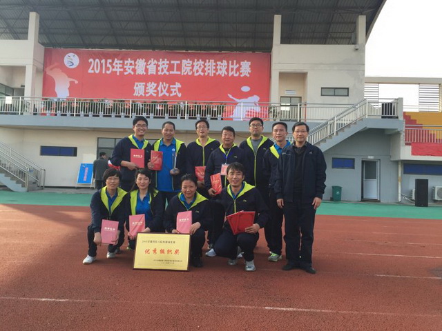 2015年全省技工院校排球赛于2015年11月14日、15日在芜湖技师学院举行,我校教工排球队参加了两天的比赛。排球队全体队员团结一心、奋力拼搏,一路过关斩将,冲入冠亚军争夺赛。在与同城的蚌埠机电技师学院争夺冠军的比赛中,以18:20,15:11,13:15的微弱劣势惜败,获得第二名。