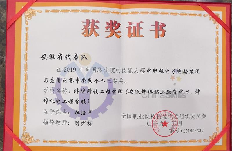 5月29日—5月31日,2019年全国职业院校技能大赛(中职组)电子电路装调与应用赛项在重庆市渝北职业教育中心举行,来自全国37个省、直辖市、自治区及计划单列市的共104名参赛选手同台竞技,经过激烈角逐,我校周少梅老师指导的学生杜浩宇喜获国赛三等奖(排名第36名)。
