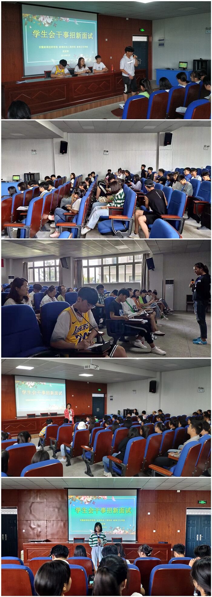 面试开始校学生会主席丁旭,向新生做了发言,指出学生会招新的意义与本次面试的纪律。随后面试招新正式开始,同学们在演讲台前侃侃而谈,落落大方的回答学生会干部提出的问题。面试结束后,校学生会秘书部依据招新分数进行排序筛选,并将入选结果公示在信息公布栏中。