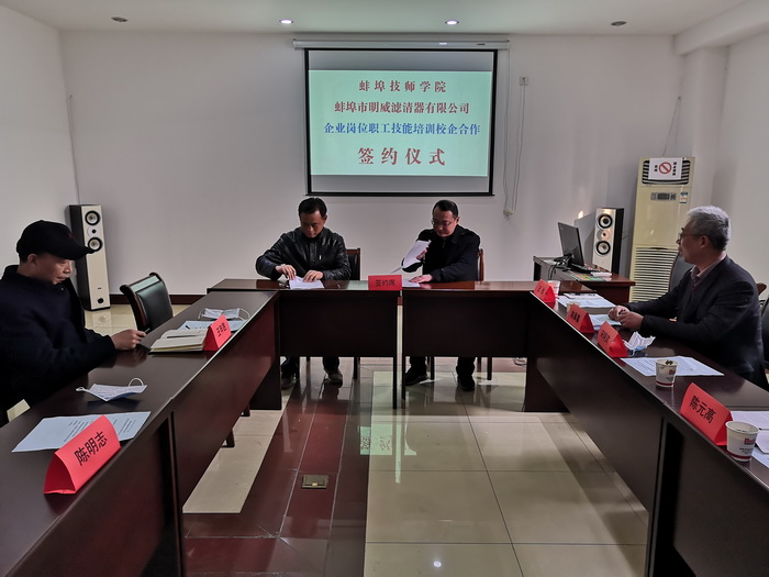 当前,疫情防控形势持续向好,企业复工复产不断推进。作为全市技工教育和职业培训的主体和骨干力量,蚌埠技师学院助力企业职工技能培训工作也在不断推进。4月3日下午,学院与蚌埠明威滤清器有限公司校企职业技能培训合作签约仪式在公司会议室举行,院党委书记陈元高、院长宋晓宾,公司董事长陈明志、总经理王年胜等领导出席仪式,市人社局职业能力建设科科长刘康到会祝贺。这是疫情期间,学院统筹推进疫情防控和校企合作职业技能培训结出的又一硕果。