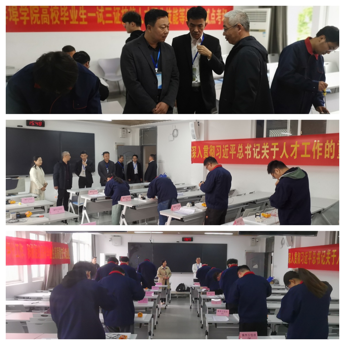 蚌埠技师学院积极响应市人社局的号召,2024年4月30日在蚌埠学院开展了职业技能 人才评价“一试三证”工作。此次活动是2024年以来蚌埠市首次在高校举行的毕业生技能人才评价,也是蚌埠市贯彻省厅关于高校毕业生“一试三证”工作的重要举措。蚌埠市人社局、蚌埠技师学院高度重视,市人社局副局长孙敦一、蚌埠技师学院常务副院长陈华坤等一行亲临评价现场督考。