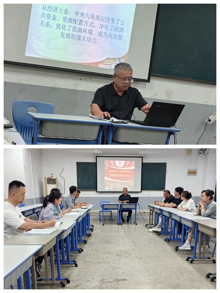 6月10日下午,学院副院长姚卫宁以《学深悟透中央八项规定精神实质 做高质量发展的实干家》为题,为二支部党员带来了一节深刻且生动的专题党课。课程从政治、经济、社会、文化、国家治理五个角度深入剖析了中央八项规定精神的深远影响,并结合实际工作,号召全体党员以作风建设新成效推动学院高质量发展。