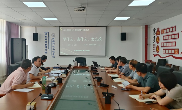 2025年6月13日下午,蚌埠技师学院第一党支部在行政楼407会议室,支部书记方习贵同志以"深入贯彻中央八项规定精神学习教育"为主题,上了一节专题党课,支部全体党员参加。