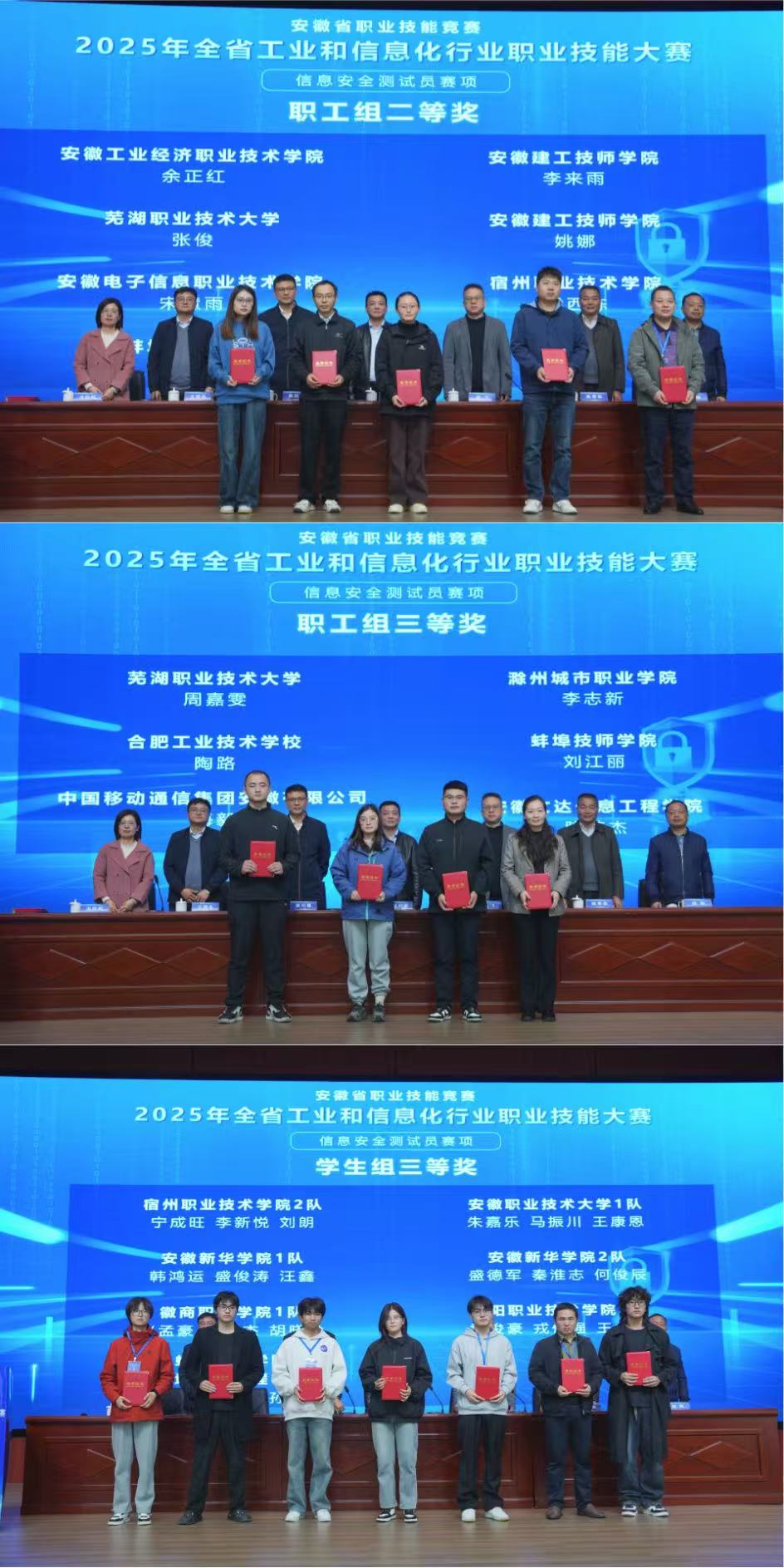 10 月 25 日,2025 年“安徽省工业和信息化行业职业技能大赛信息安全测试员”赛项在安徽工业经济职业技术学院正式开赛,来自全省 11 个地市的 220 余名本科、高职、技工院校以及高新技术企业选手齐聚赛场,围绕网络安全核心技术展开激烈角逐。蚌埠技师学院电子信息工程系教师团队表现亮眼,教师廖康康、刘江丽分别斩获职工组二等奖、三等奖,胡子杭、孙妙可等三名学生在德吉拉姆和廖康康教师的共同指导下获得学生组三等奖,充分展现了我校的教学实力与师资水平。