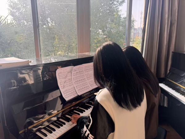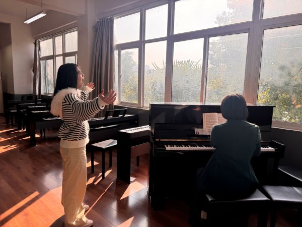 走进集训琴房,时间仿佛被按下了慢放键,却又在分秒间见证着质的飞跃。在钢琴集训点,指尖在黑白键上高速飞舞,复杂的琶音、精准的节奏、细腻的情感处理,每一个乐句都被反复打磨。而在声乐集训室,则是一场关于气息、共鸣与情感的较量。从意大利语歌剧选段到高难度的中文艺术歌曲,队员们在指导老师的点拨下,调整着每一个元音的纯度、每一处换气的时机。从最基础的儿歌弹唱到合作完成四手联弹的钢琴曲和声乐艺术歌曲,面对全新的挑战同学们在指导老师的悉心陪伴与不断鼓励下,跨越了技术与心理的双重关卡,最终在团队协作中完成作品。