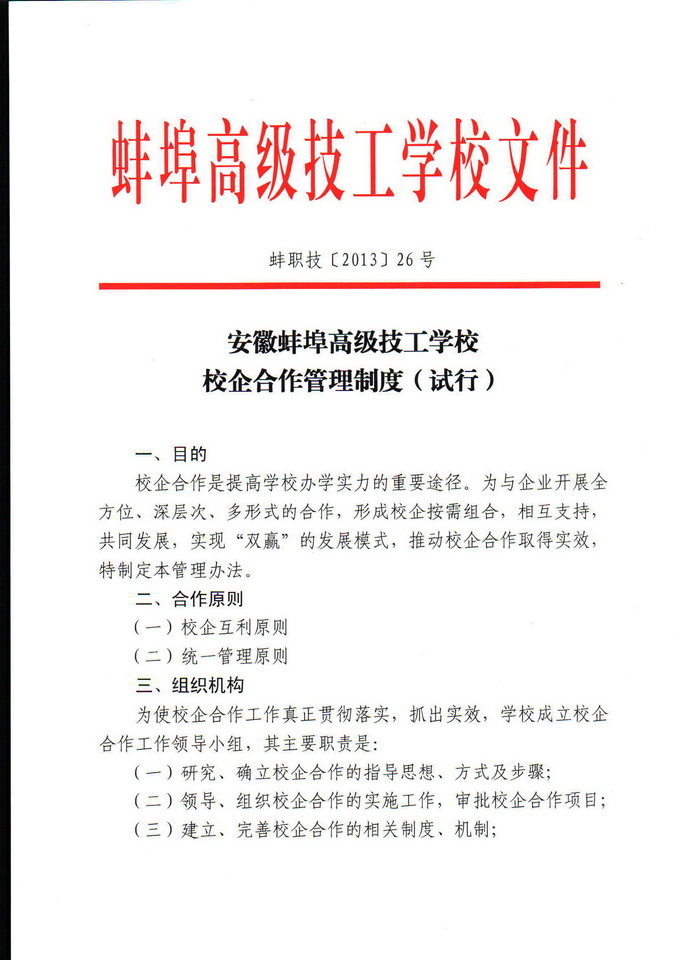安徽蚌埠高级技工学校校企合作管理制度(试行)